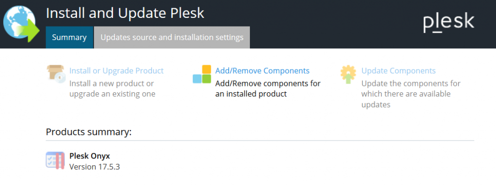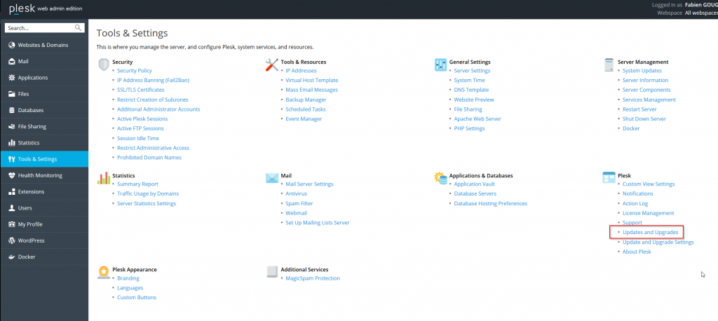 Pour ajouter les composants, il faut aller dans Tools & Settings puis Updates and Upgrades dans la catégorie Plesk. Une nouvelle fenêtre va apparaitre.