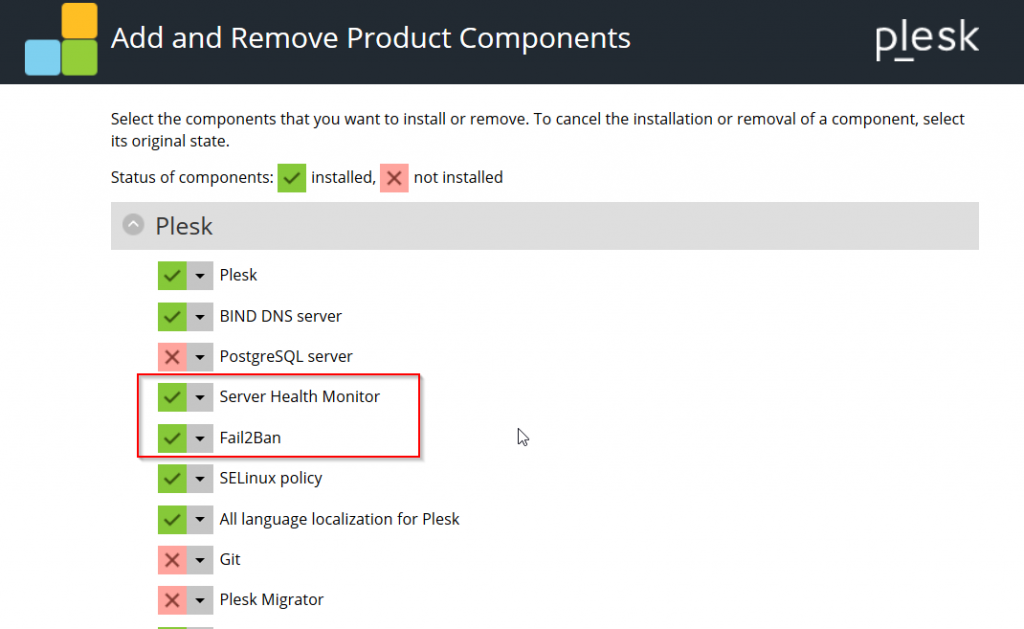 Ajouter les composants suivants : Fail2ban et Server Health Monitor puis valider.