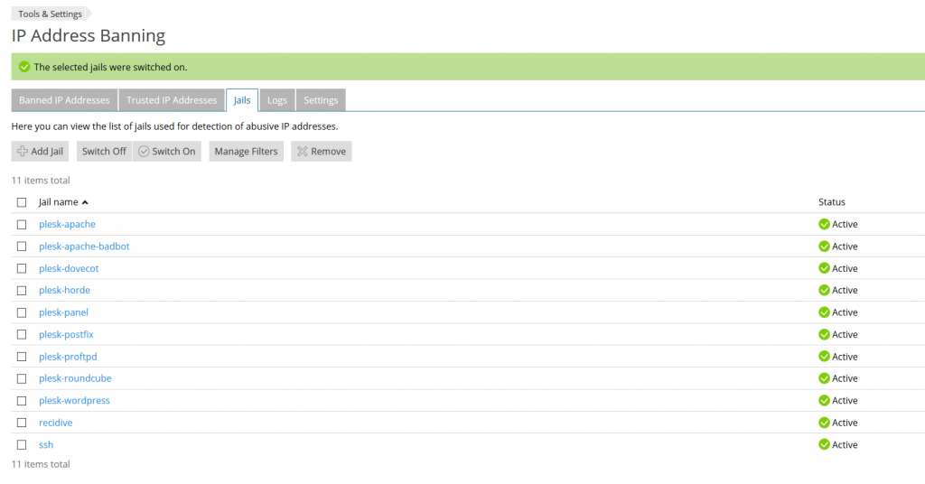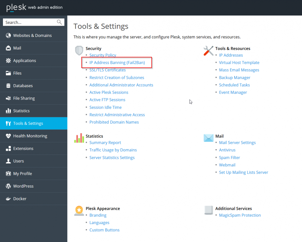Revenez à l’écran de configuration Plesk dans Tools & Settings puis IP Address Banning (Fail2Ban).