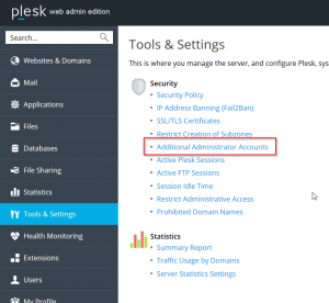 Afin d’éviter de se logger en root sur votre serveur Plesk, je vous recommande de créer un utilisateur dédié pour sa gestion. Rendez vous dans Tools & Settings puis Additional Administrator Accounts.