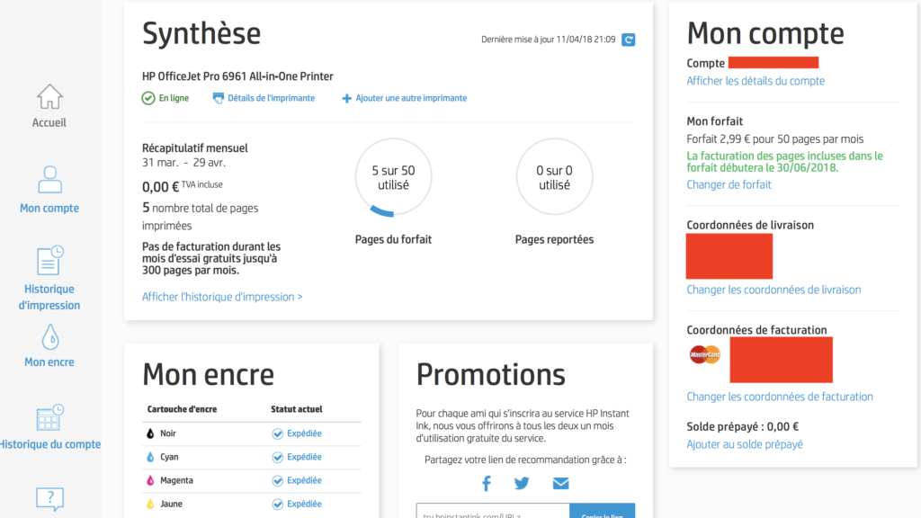 Une fois inscrit sur le site, ajouté le rib et remplit l’adresse postale, et une fois l’imprimante paramétrée, nous avons accès à une interface de gestion récapitulant les infos.
