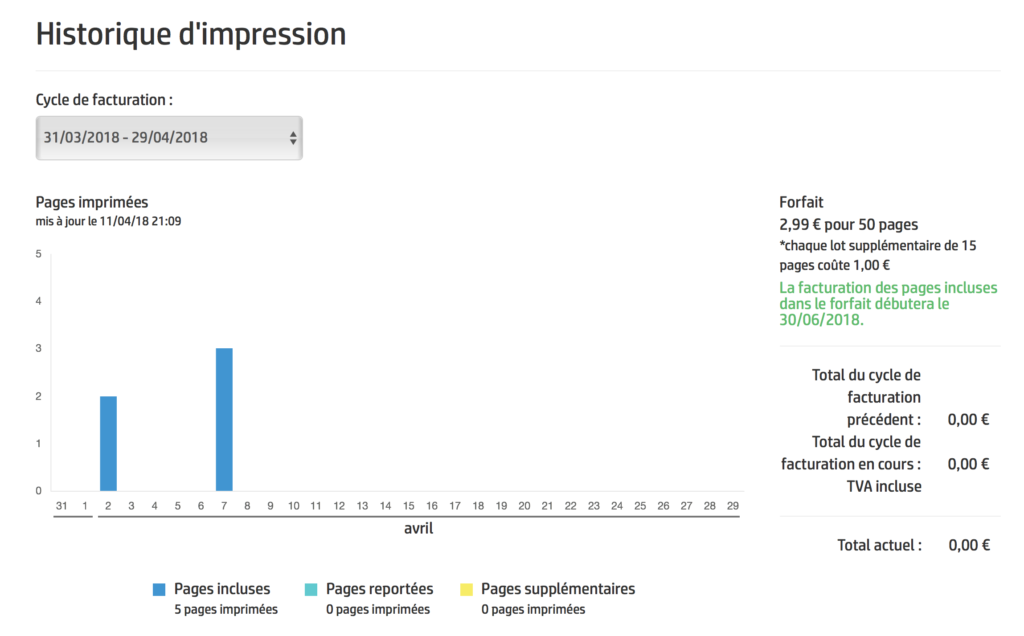 - chez instant ink, c’est 2,99€ par mois soit 36€/an pour … 600 pages ! Le calcul est vite fait … et je suis sur que personne ne passe 600 pages par an à la maison.
