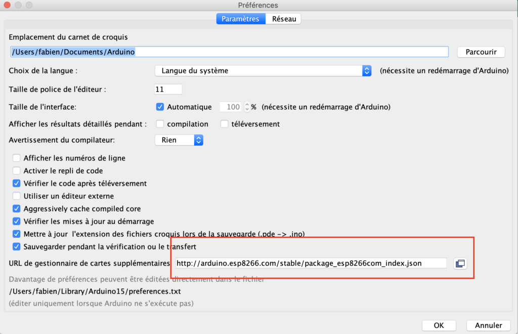 Dans Arduino, il faut d’abord remplir l’url http://arduino.esp8266.com/stable/package_esp8266com_index.json dans les préférences puis URL de gestionnaires de cartes supplémentaires.