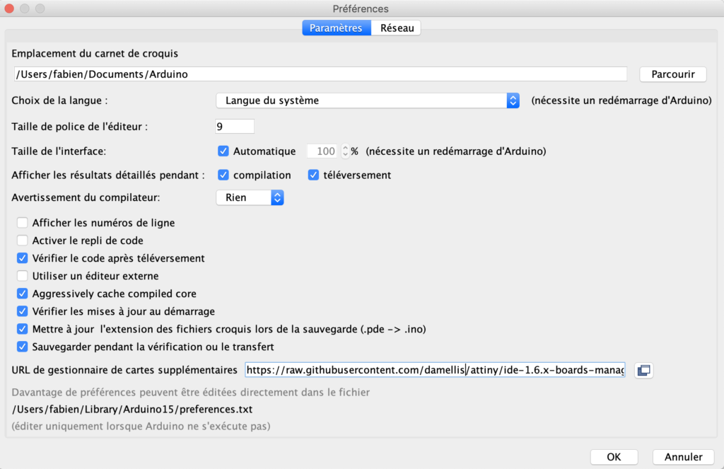 Il faut d’abord aller dans les préférences de l’Arduino (Arduino -> Préférences et lui rajouter l’url de gestionnaire de cartes suivante : https://raw.githubusercontent.com/damellis/attiny/ide-1.6.x-boards-manager/package_damellis_attiny_index.json