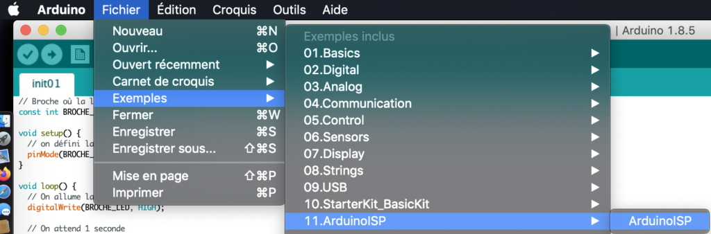 Ensuite, il faut charger le programme ISP sur l’Arduino pour pouvoir ensuite programmer les ATTiny. Lancer le programme d’exemple ArduinoISP via Fichier -> Exemples -> 11. Arduino ISP -> Arduino ISP