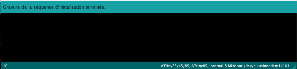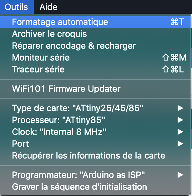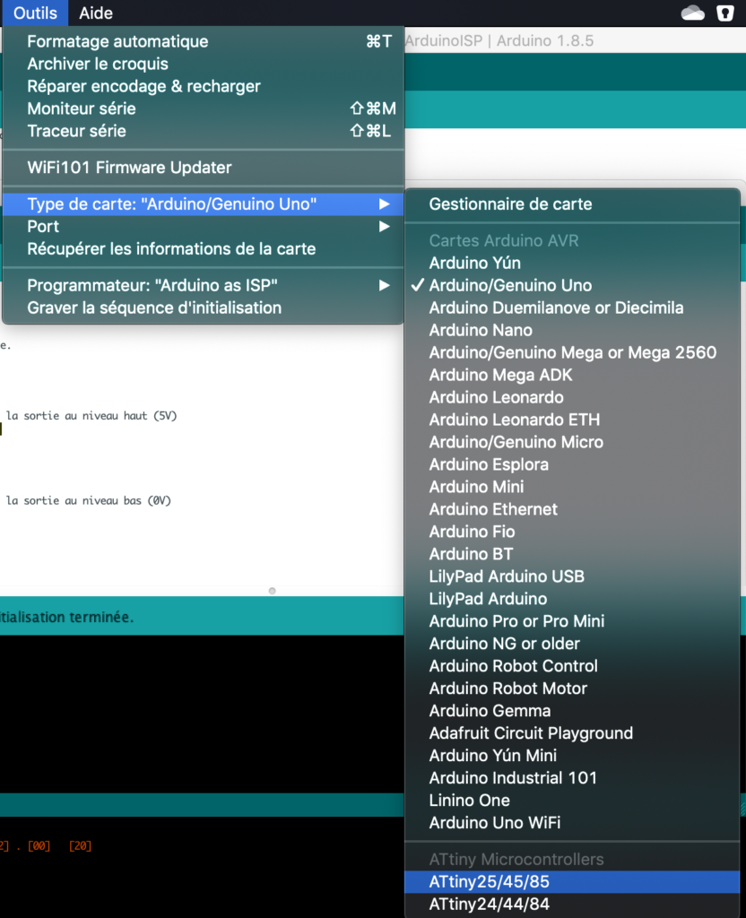 Pour pouvoir téléverser un programme sur l’attiny85, il faut au préalable le préparer. On va tout d’abord graver la séquence d’initialisation. Pour ce faire, brancher votre attiny sur votre arduino puis, sélectionner Outils -> Type de carte -> Attiny 25/45/85