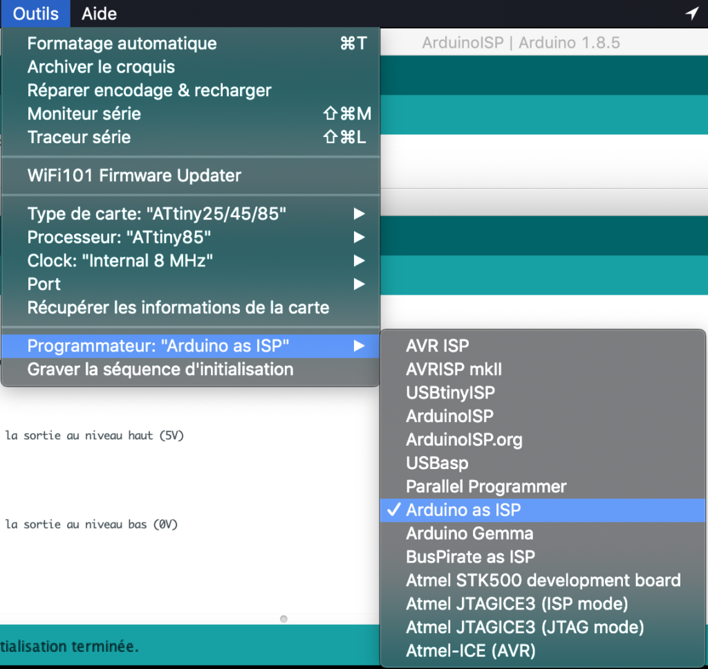 Puis, très important, il faut choisir le programmateur. Dans outils -> programmateur, sélection Arduino as ISP.