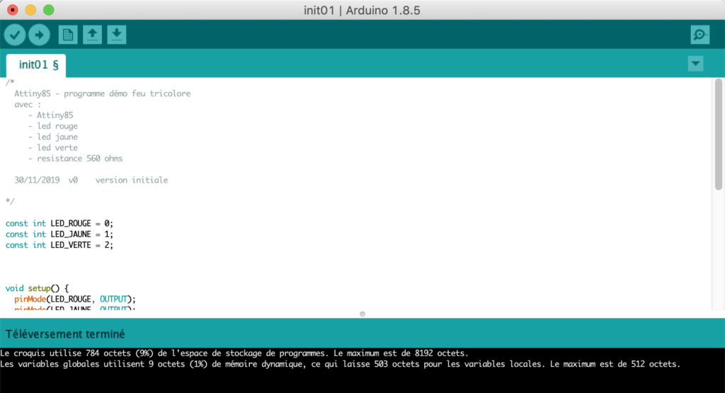 Ca y est, l’attiny est prêt à recevoir son premier programme. Je vous propose de coder un feu tricolore, avec 3 leds : vert, jaune rouge. Vert sera allumé 5 sec, jaune 2 sec et rouge 8 sec, soit des cycles de 15 secondes.