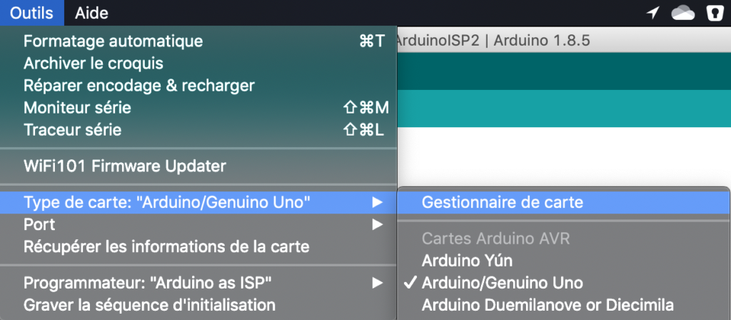 Puis on va aller dans le gestionnaire de cartes pour installer la attiny. Aller dans outils -> type de carte -> gestionnaire de carte.