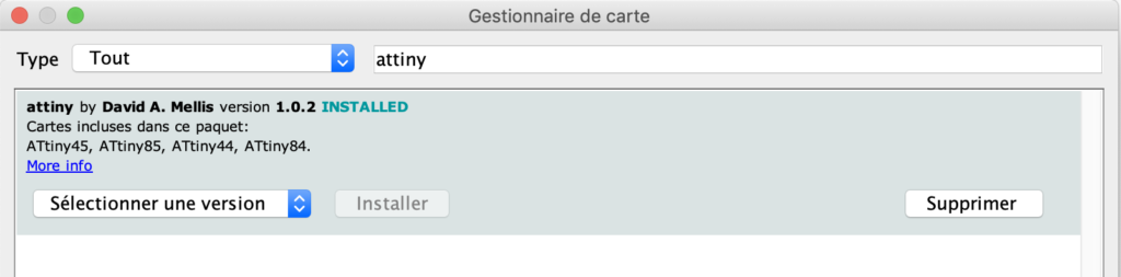 Chercher attiny, sélectionner celui de David A. Mellis et cliquer sur installer.