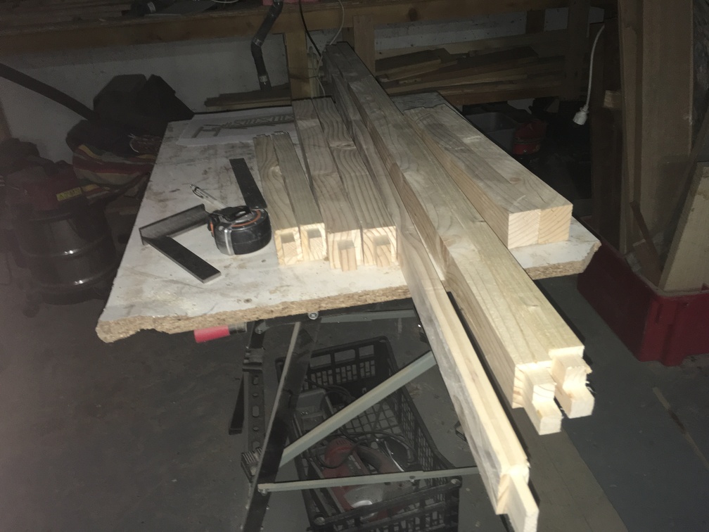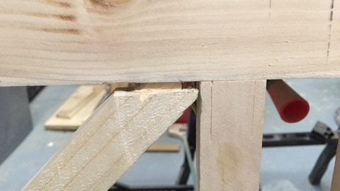 Une fois mes tenons faits, je m’attaque aux mortaises… Je n’aime pas faire ca et encore moins dans du pin de récup… Le bois est fragile et filandreux…