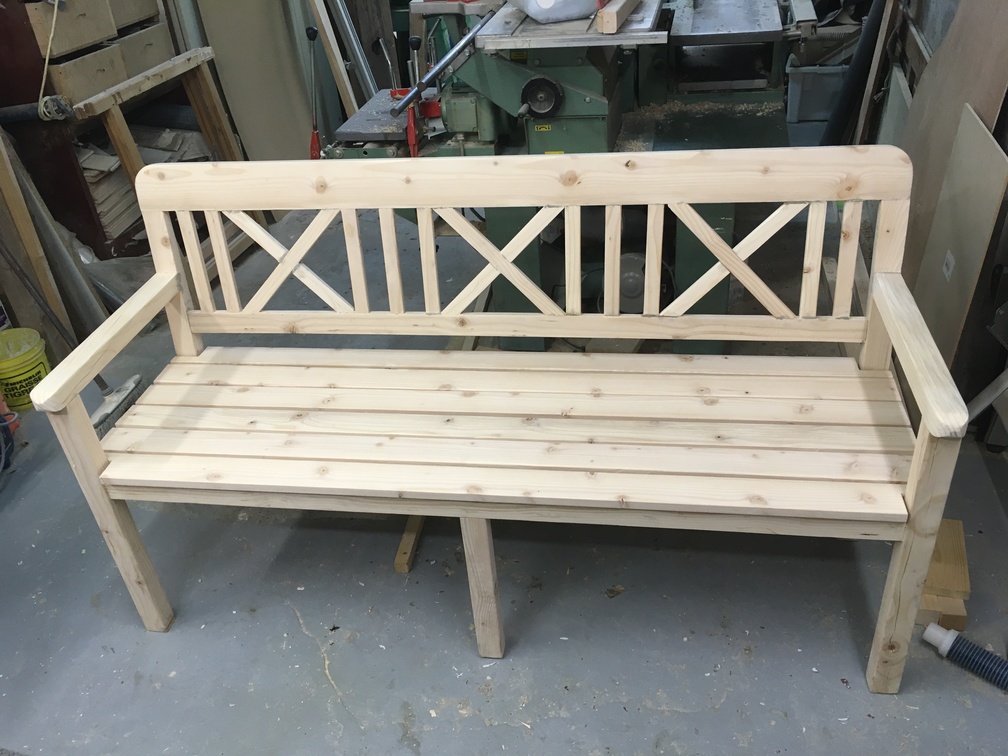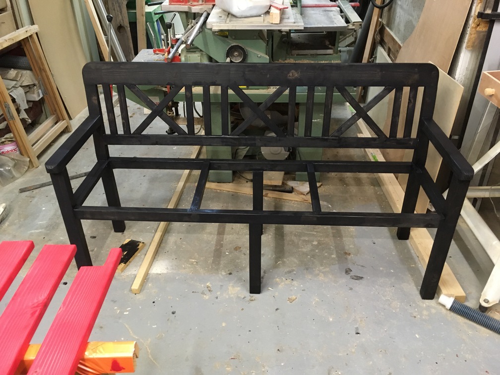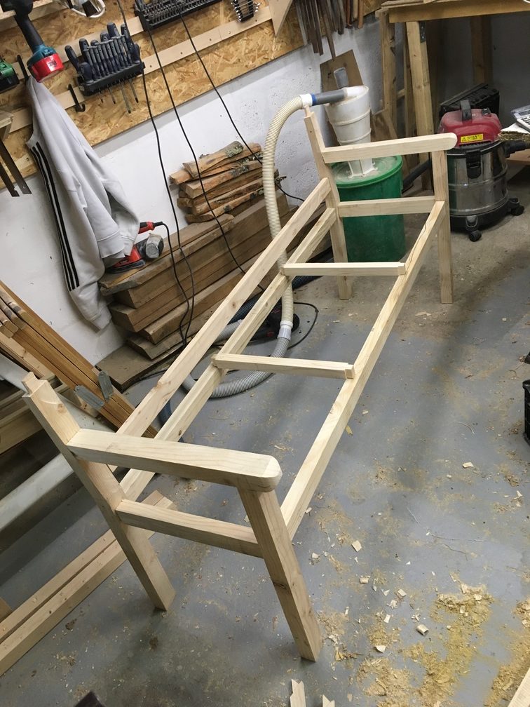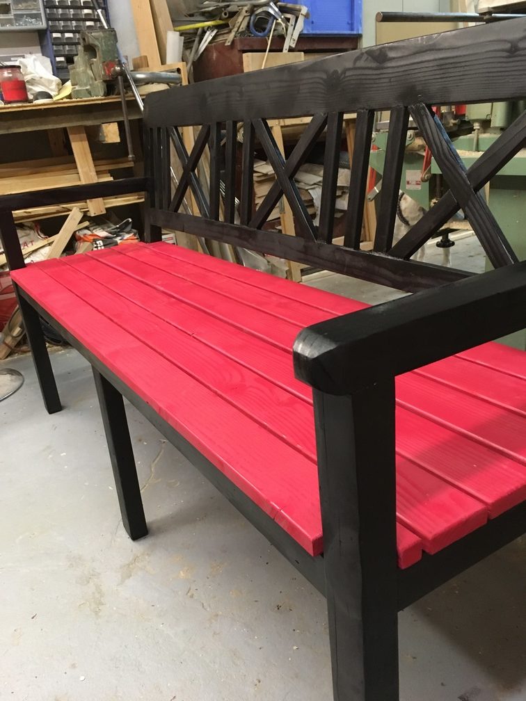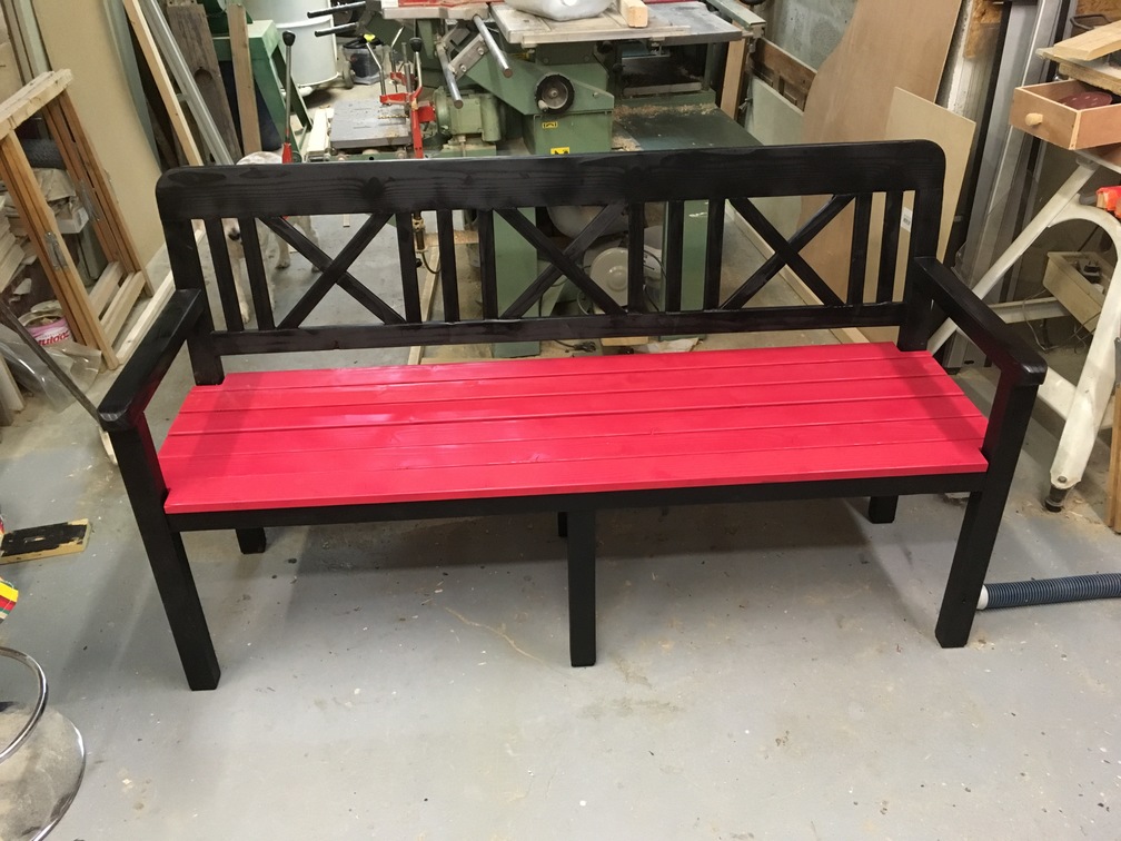 Voici à quoi ressemble le banc à l’atelier puis à sa place 🙂