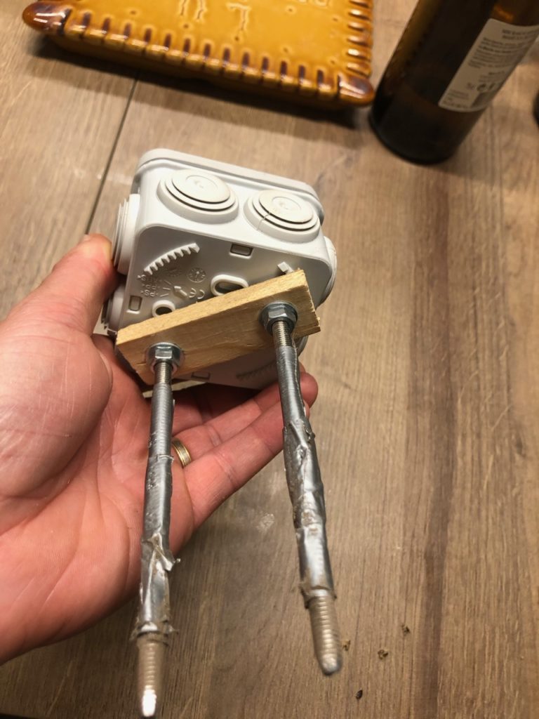 Les 2 plots qui vont en terre sont des tiges filetées de 5mm, longues de 15cm. L’ensemble est mis dans une boite de dérivation Schneider de 7cmx7cm, fixé avec une plaque de bois et des ecrous rondelles. L’écartement de mes deux tiges filetées est de 4,3cm.