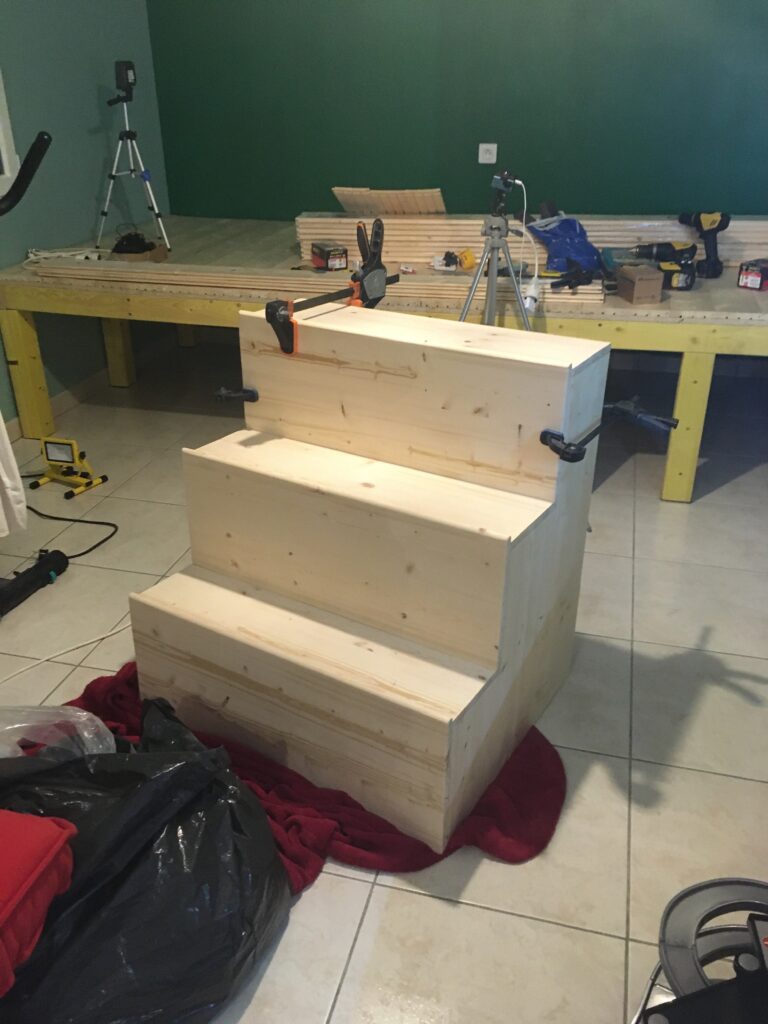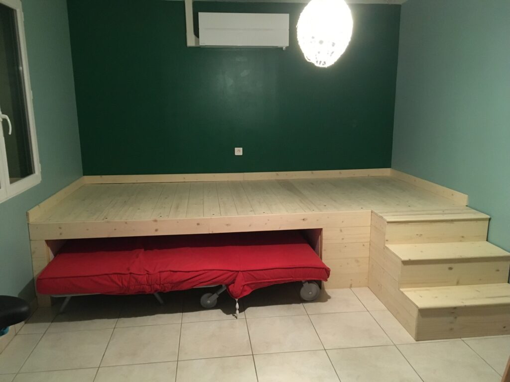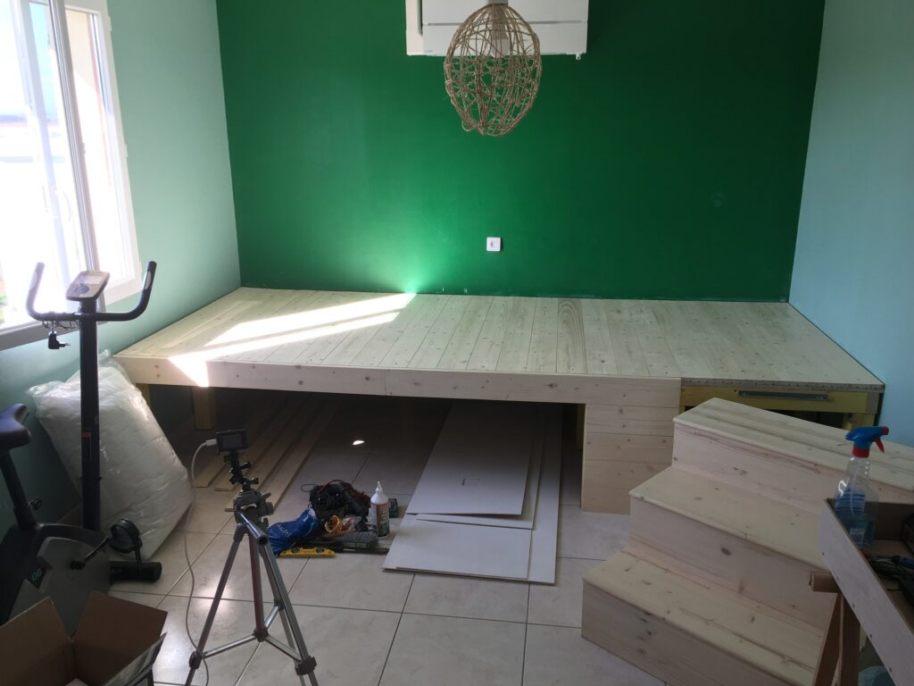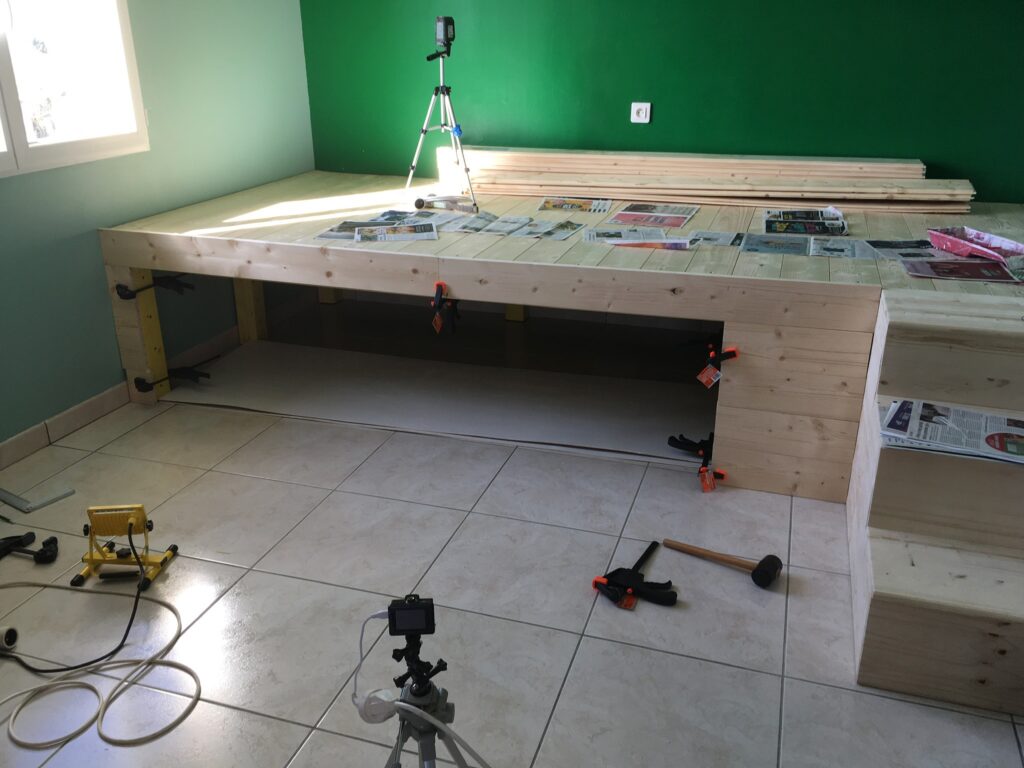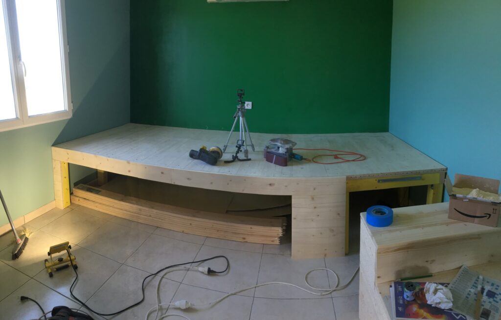 Avant de passer à la finition, nous souhaitions faire de cette estrade un coin sympa et un peu design or pour le moment, elle est tout à fait standard et n’a rien de « wahou » !