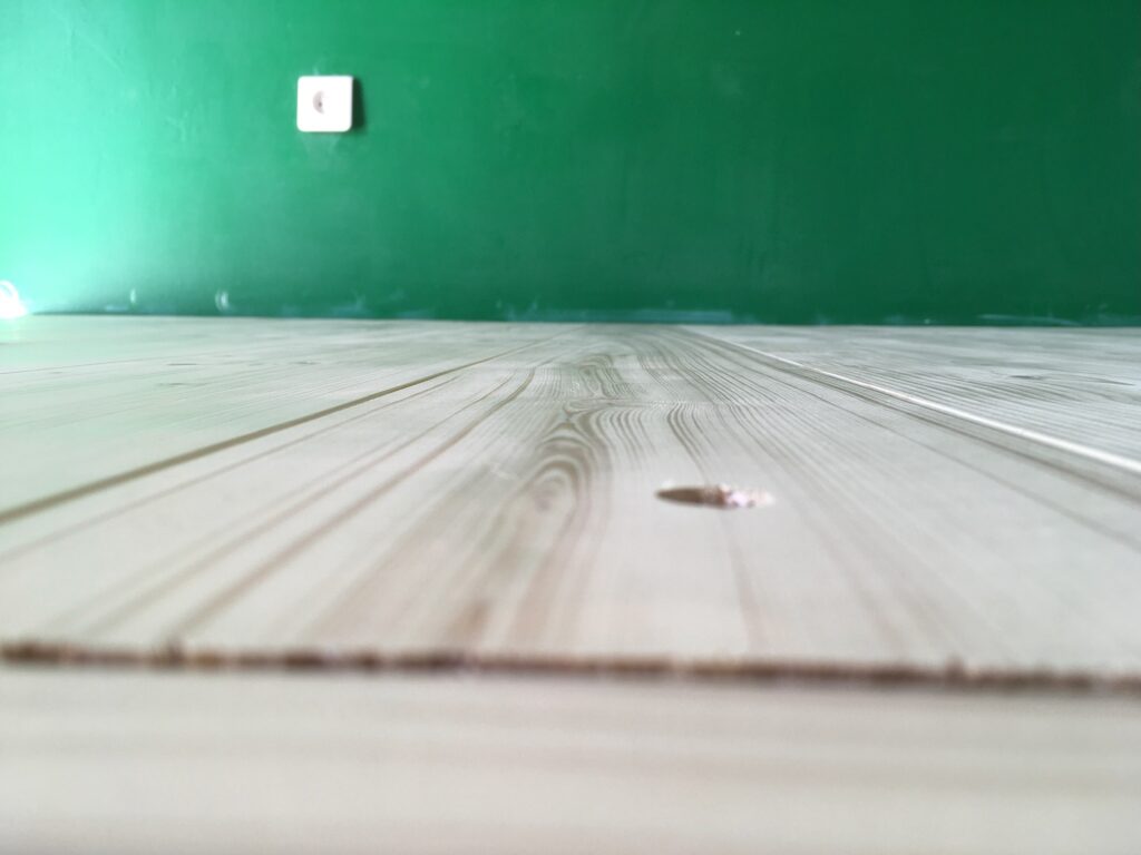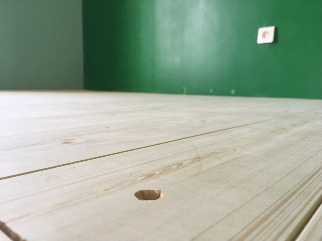 Le parquet est un parquet massif en pin. Le choix s’est porté sur cette typologie de parquet de part son tarif abordable et la facilité pour le trouver au moment de la construction.