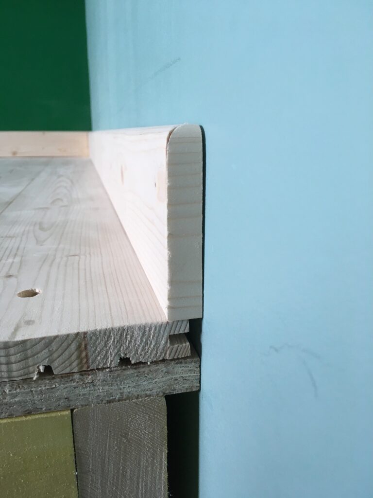 Enfin et pour finir cet espace, je m’attaque aux plinthes! Là aussi j’ai du faire une petite astuce pour finir propre la pose des plinthes!