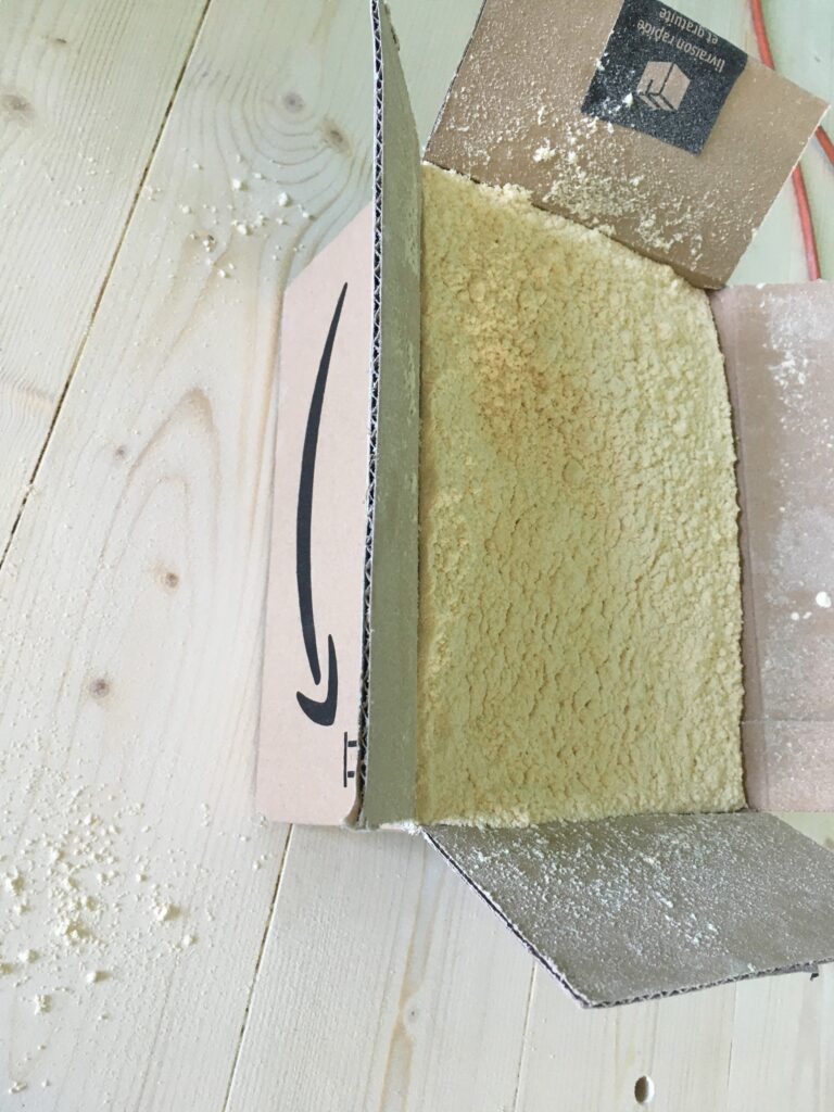 Le carton de sciure (je n’avais pas d’aspirateur)