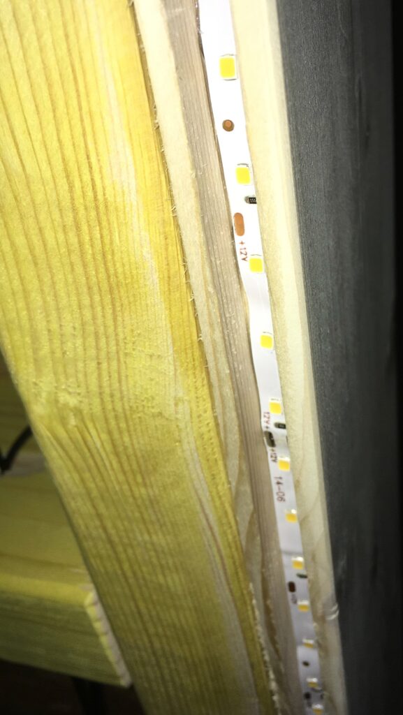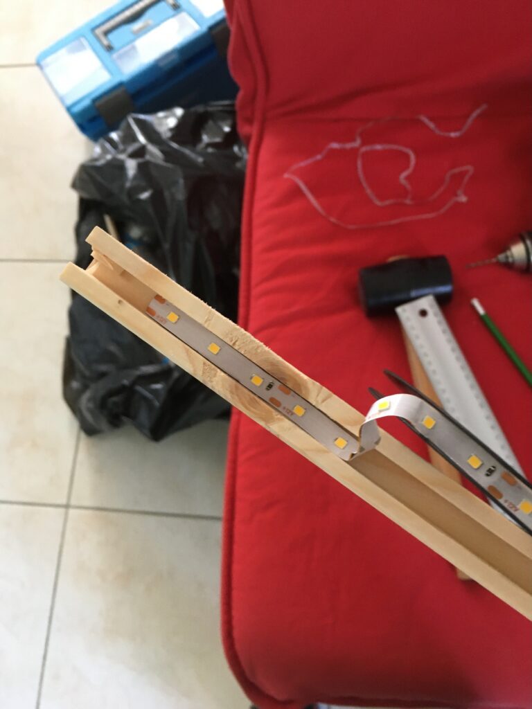 je décide donc d’insérer un ruban led dans le bardage qui passe dans le vide, là où sera le lit!
