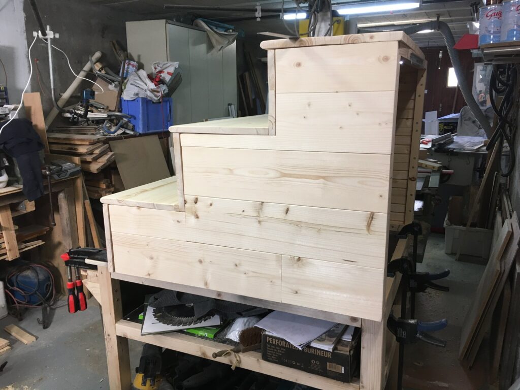 Le ponçage n’est pas la partie que je préfère, un peu comme toutes les finitions. Dans le cas de cette estrade, le ponçage fut long…
