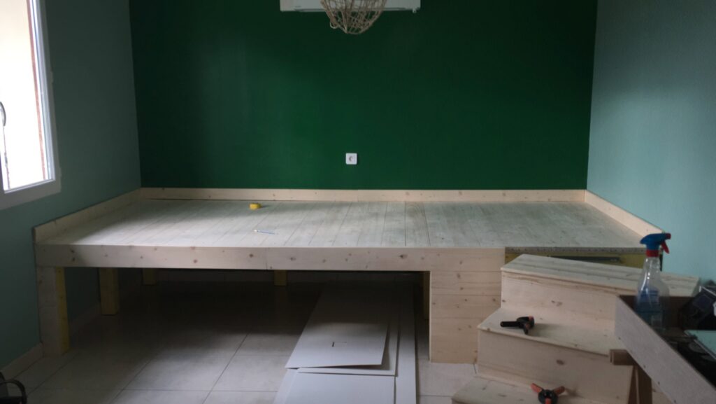 Les planches sont posées en long dans la profondeur de l’estrade. J’ai fait ce choix afin de limiter et faciliter les coupes!