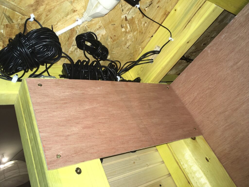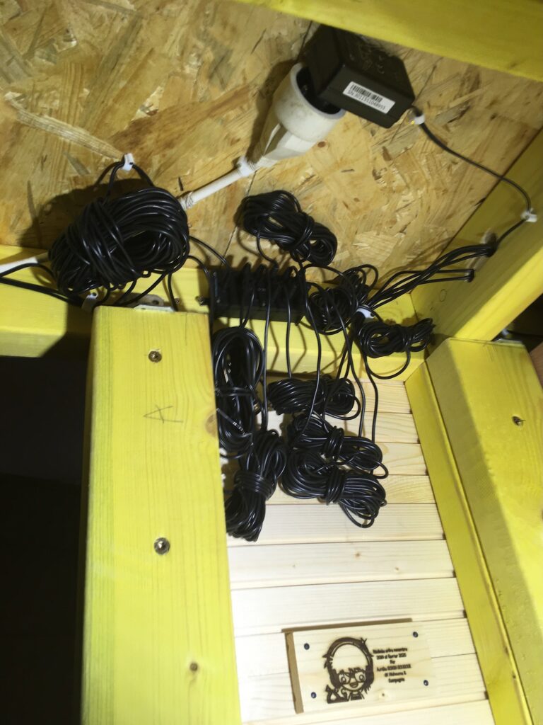 Une fois le métallisant posé une grosse semaine plus tard, je m’attaque au remontage des spots, et j’installe définitivement la partie électrique. Il y a tellement de câbles (longueur de câble disponible pour les spots assez grande) que j’ai fait un cache afin que l’on n’accroche pas ces câbles lorsque l’on dépose des choses sous l’estrade.